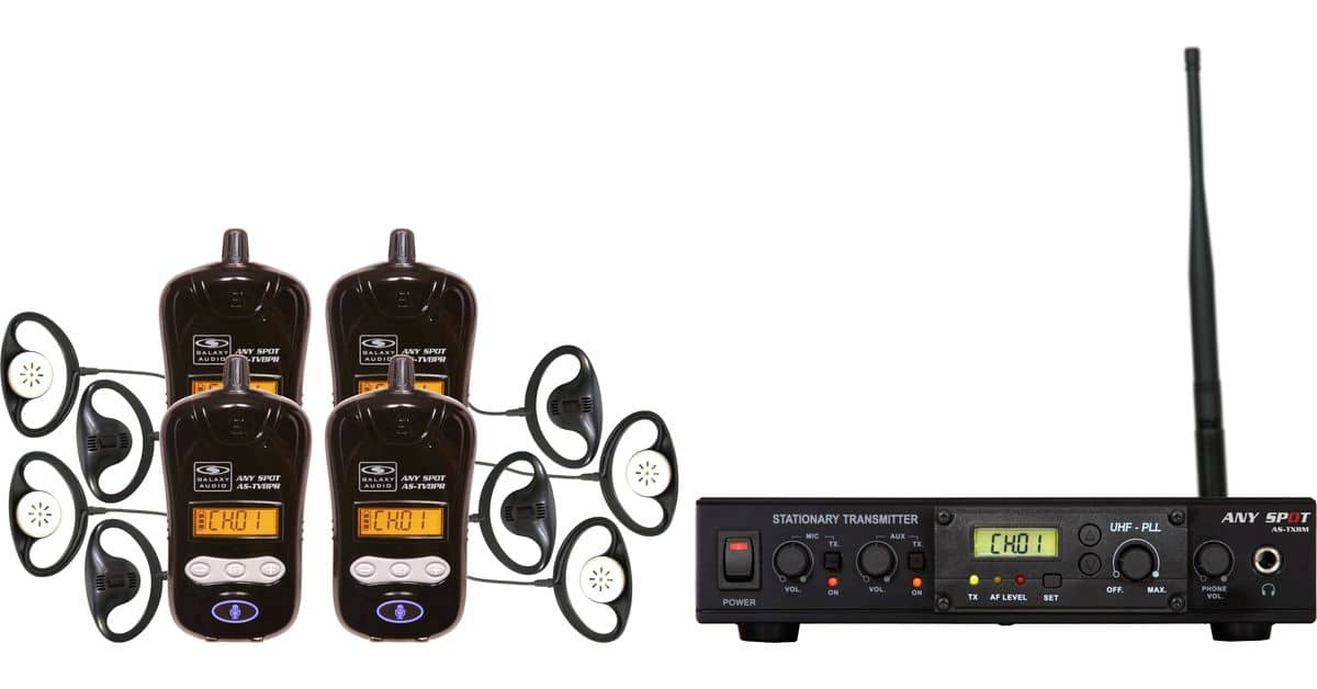 • Includes: 1 AS-TXRM table top transmitter, 4 AS-TVBPR receivers, 2 AS-DCBPTR chargers, & 4 sets of ear cups