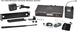 210 selectable channels, includes (1) AS-1200T, (2) AS-1200R, (2) EB4 ear buds, single/dual rack kit, antenna, and power supply.