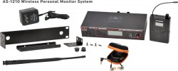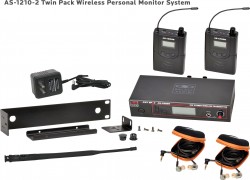 210 selectable channels, includes (1) AS-1200T, (2) AS-1200R, (2) EB10 ear buds, single/dual rack kit, antenna, and power supply.