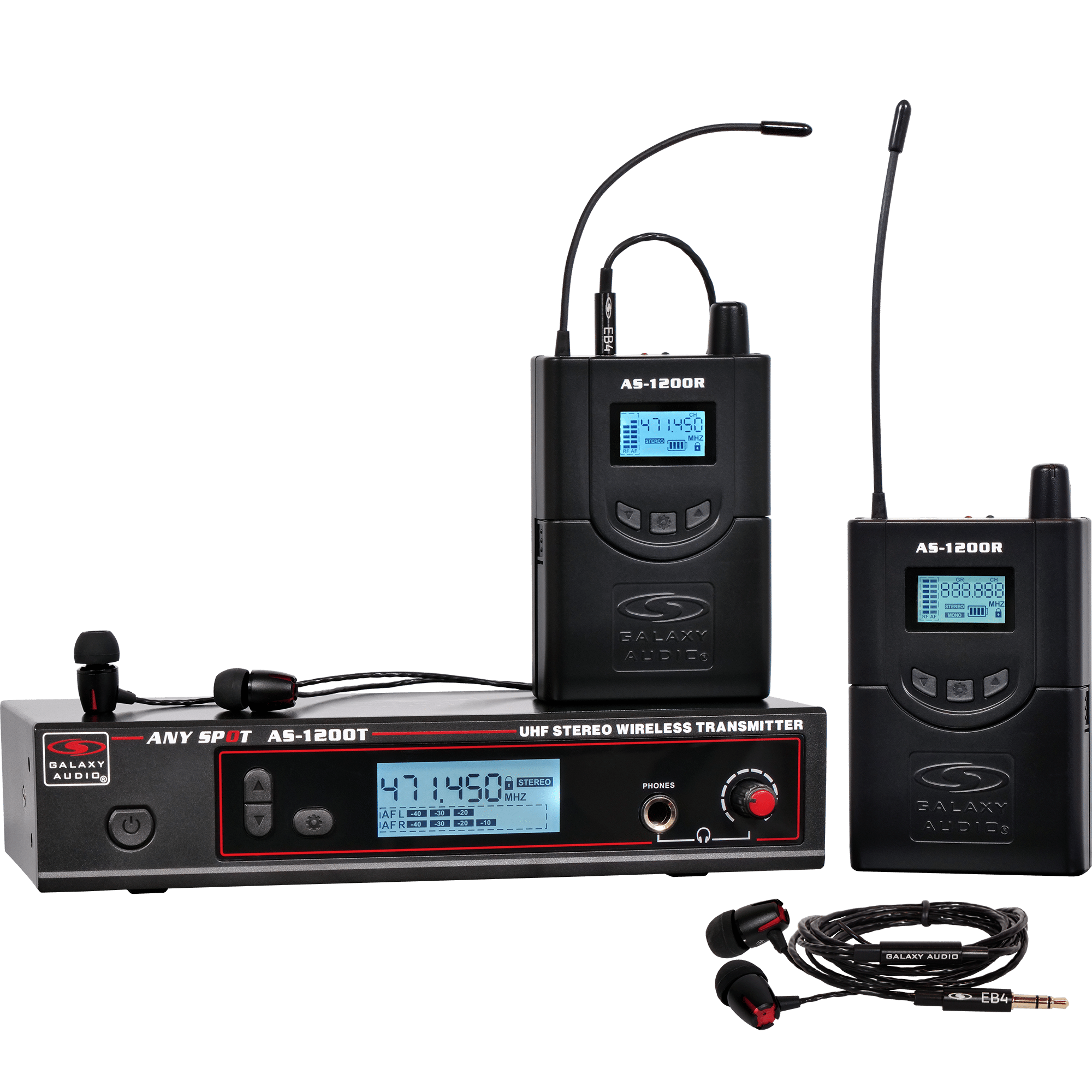 The AS-1200R receiver offers a backlit LCD display with Lock, Channel Number, Stereo, Mono, Frequency, RF/AF Level and 4 Bar Battery Indicator, plus an RF and Stereo indicator LED on top of the body pack. Featuring 100mW stereo output, the AS-1200R delivers more than enough gain for any live stage performance. The included EB4 ear buds feature titanium drivers, extended bass response and aluminum alloy construction. Upgrade to Galaxy Audio EB6 or EB10 ear buds or use your custom fit or favorite set of ear buds. The AS-1200 accepts all ear buds that utilize the 1/8- inch (3.5 mm) stereo headphone jack.