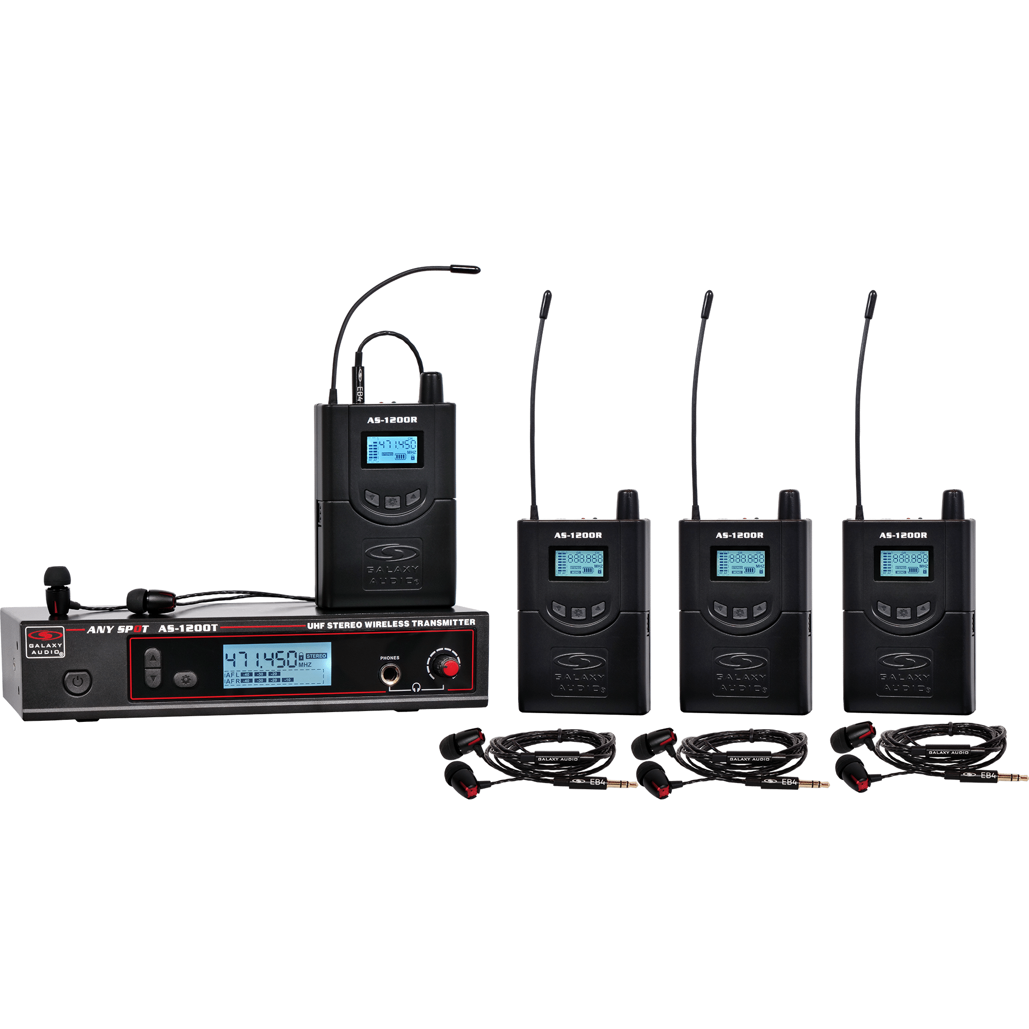 210 selectable channels, includes (1) AS-1200T, (4) AS-1200R, (4) EB4 ear buds, single/dual rack kit, antenna, and power supply.