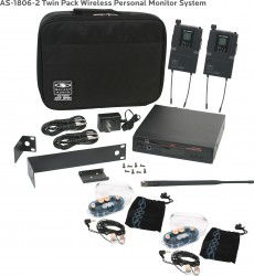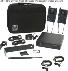 AS-1800-2 Wireless In-Ear Monitor Twin Pack System with Standard EB4 Ear Buds:640 selectable frequencies; 32 selectable channels, includes (1) AS-1800T, (2) AS-1800R, (2) EB4 ear buds, single/dual rack kit, antenna, two 1/4″ to 1/4″ cables, nylon case, and power supply. Additional products in this configuration: |