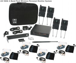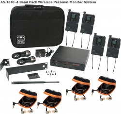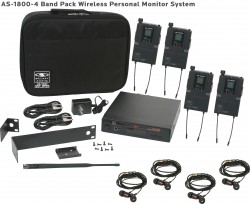 AS-1800-4 Wireless In-Ear Monitor Band Pack System with Standard EB4 Ear Buds:640 selectable frequencies; 32 selectable channels, includes (1) AS-1800T, (4) AS-1800R, (4) EB4 ear buds, single/dual rack kit, antenna, two 1/4″ to 1/4″ cables, nylon case, and power supply. Additional products in this configuration: |