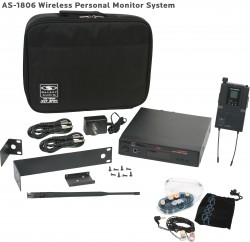 AS-1806-4 Wireless In-Ear Monitor Band Pack System with EB6 Ear Bud Upgrade:640 selectable frequencies; 32 selectable channels, includes (1) AS-1800T, (4) AS-1800R, (4) EB6 ear buds, single/dual rack kit, antenna, two 1/4″ to 1/4″ cables, nylon case, and power supply. Additional products in this configuration: |