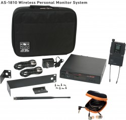 AS-1810 Wireless In-Ear Monitor with EB10 Ear Bud Upgrade:640 selectable frequencies; 32 selectable channels, includes 1 AS-1800T, 1 AS-1800R, EB10 ear buds, single/dual rack kit, antenna, two 1/4″ to 1/4″ cables, nylon case, and power supply. Additional products in this configuration: |