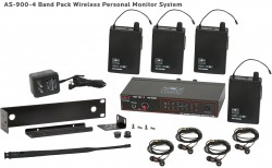 AS-900-4 Wireless In-Ear Monitor Band Pack System with Standard EB4 Ear Buds:Fixed UHF frequency options, includes (1) AS-900T, (4) AS-900R, (4) EB4 ear buds, single/dual rack kit, antenna, and power supply. Additional products in this configuration: |