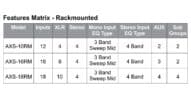 The AXS line features a full line of analog audio mixers. The AXS series offers 5 different desk top models with 3 available in a rack mount version. All models have a USB connection to link to a computer for stereo playback or recording and have +48V phantom power to the XLR inputs. Additionally, all mono inputs provide an easy to use single knob compression. Most models feature a 3 band EQ with sweep-able mid-range and low cut filter. All models include AUX sends on each channel which are either pre/post or switchable for monitoring/FX or external send.