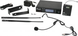 DHTR/76HSHeadset Mic: Uni-directional, Frequency Response 50Hz-18kHz. This system includes the DHTR Receiver, MBP76 Body Pack Transmitter, and the HS-U3BK Headset Microphone. |