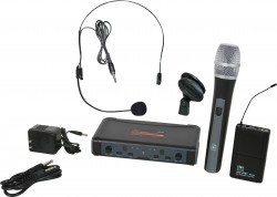 ECDR/38SVHeadset and Lavalier Microphones: Uni-Directional. This system includes the ECDR Receiver, 2 MBP38 Body Pack Transmitters, the HS13-UBK Headset Microphone, and the LV13-UBK Lavalier Microphone. |