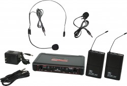 Headset and Lavalier Microphones: Uni-Directional. This system includes the EDXR Receiver, 2 MBP38 Body Pack Transmitters, the HS13-UBK Headset Microphone, the LV13-UBK Lavalier Microphone, 1/4″ to 1/4″ cable, and Power Supply