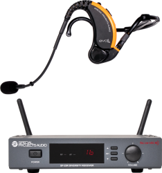 The EVO True Wireless headset mic solves all these problems and minimizes the equipment being worn. The EVO is a 16 channel UHF frequency dual ear headset mic that incorporates both headband and wireless transmitter into one compact, self-contained ergonomic design. The rechargeable mic is both splash and sweat resistant. The EVO offers a patented design that allows freedom of movement, eliminating both cable and body pack by relocating the transmitter behind the ear on the headset, for easy, carefree fitness instruction that never interferes with floor exercises. The EVO is lightweight, comfortable, and stays in place even during the most rigorous exercise routine.