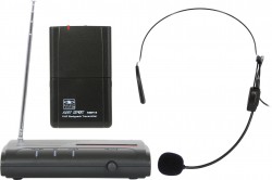 Wireless Headset Microphone System: Cardoid Polar Pattern, 9.68mm Condenser Element, 37″ (94cm) Cable with 3.5mm threaded, Windscreen. This system includes the VESR Receiver, the MBP18 Body Pack, and a headset microphone.