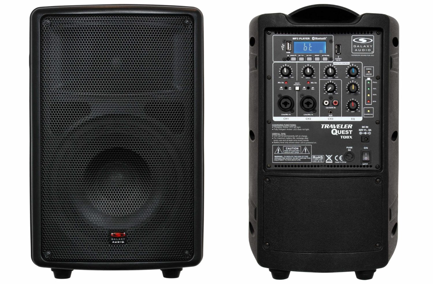 You can add up to two optional UHF or 2.4 GHz wireless mics. The Traveler Quest 8X features a built-in MP3 player with Bluetooth®, so you can easily play audio from a USB thumb/stick drive or Bluetooth®-enabled device. A voice priority button automatically reduces the music volume when a mic is in use—no straining your voice to be heard above the beat!