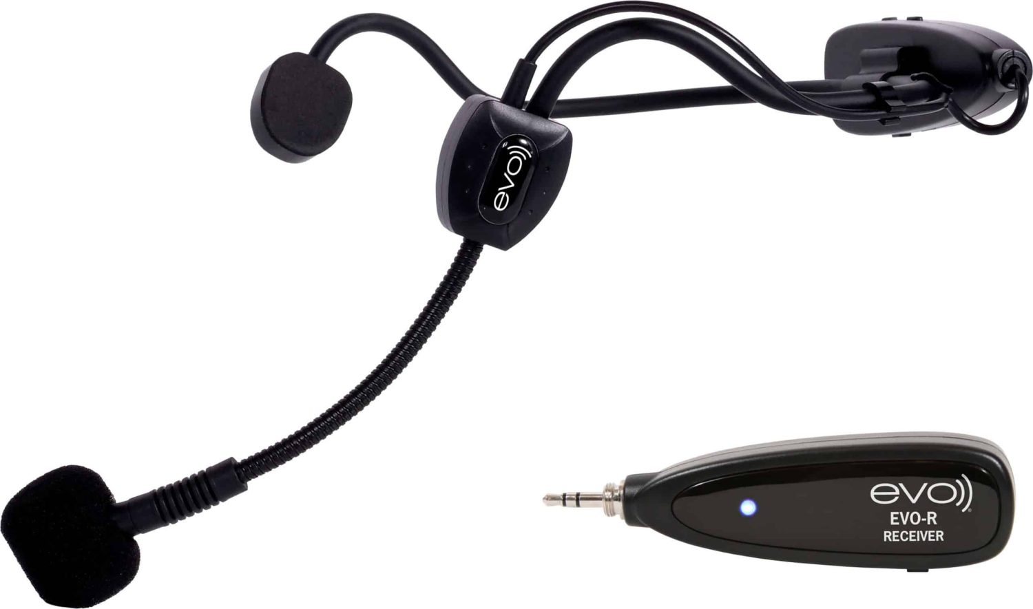 The EVO-E headset mic operates with the included pocket-sized EVO-PREC rechargeable wireless receiver for connecting to powered speakers, PA systems, existing sound systems, smart devices and laptops.